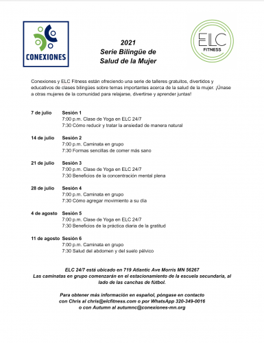 Conexiones y ELC Fitness están ofreciendo una serie de talleres gratuitos, divertidos y educativos de clases bilingües sobre temas importantes acerca de la salud de la mujer. ¡Únase a otras mujeres de la comunidad para relajarse, divertirse y aprender juntas!
