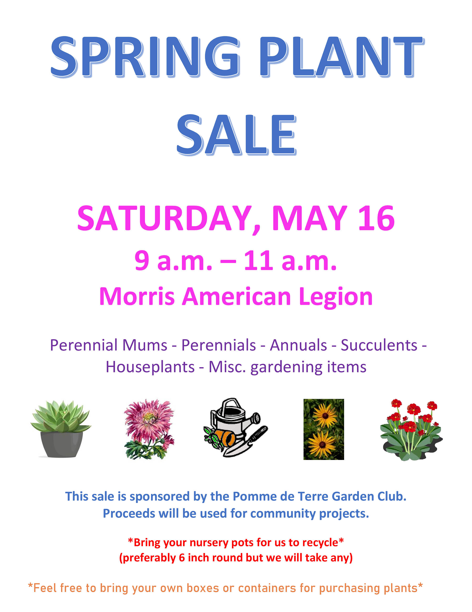 Spring Plant Sale Saturday, May 16 9 am - 11 am Morris American Legion Mums, Perennials, Annuals, Succulents, Houseplants, Garden Miscellaneous