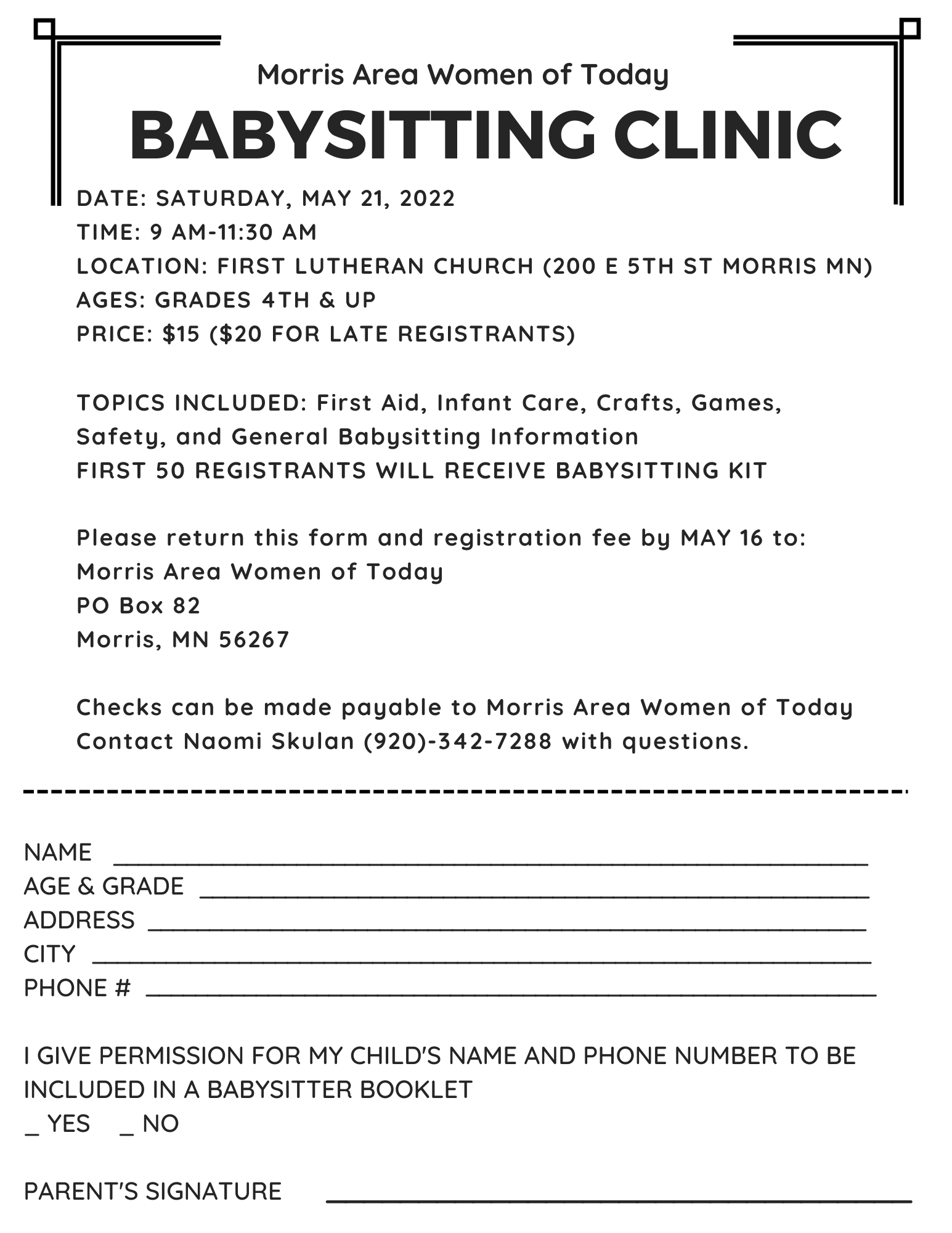 Babysitting course for new babysitters and those learning to stay safe home alone. Includes information on first aid, infant care, crafts, games, safety, and general babysitting information. Registration due by May 16, 2022. Price: $15 ($20 for late registrants).