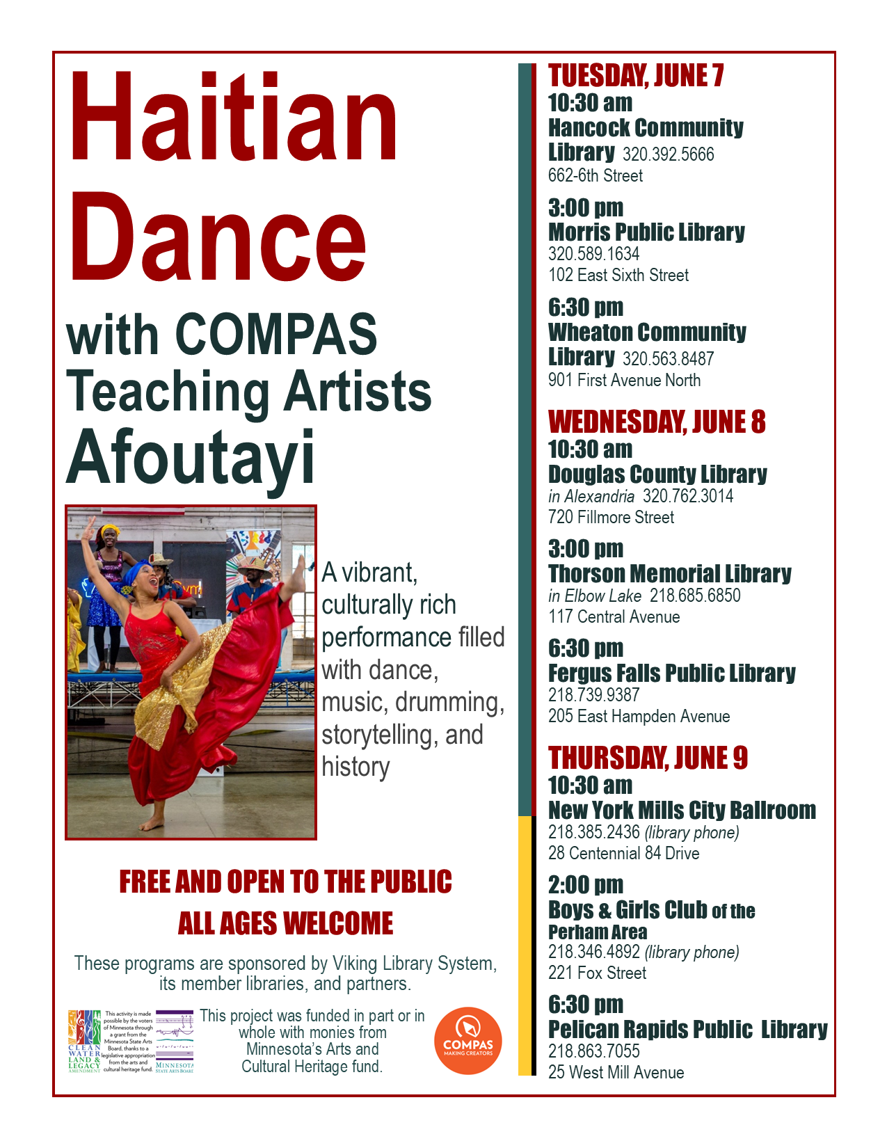 Tuesday, June 7th, 3PM A vibrant, culturally rich performance filled with dance, music, drumming, storytelling and history, featuring COMPAS teaching artists Afoutayi. This program is sponsored by Morris Public Library and Viking Library System. This project was funded in part or in whole with monies from Minnesota’s Arts and Cultural Heritage fund.