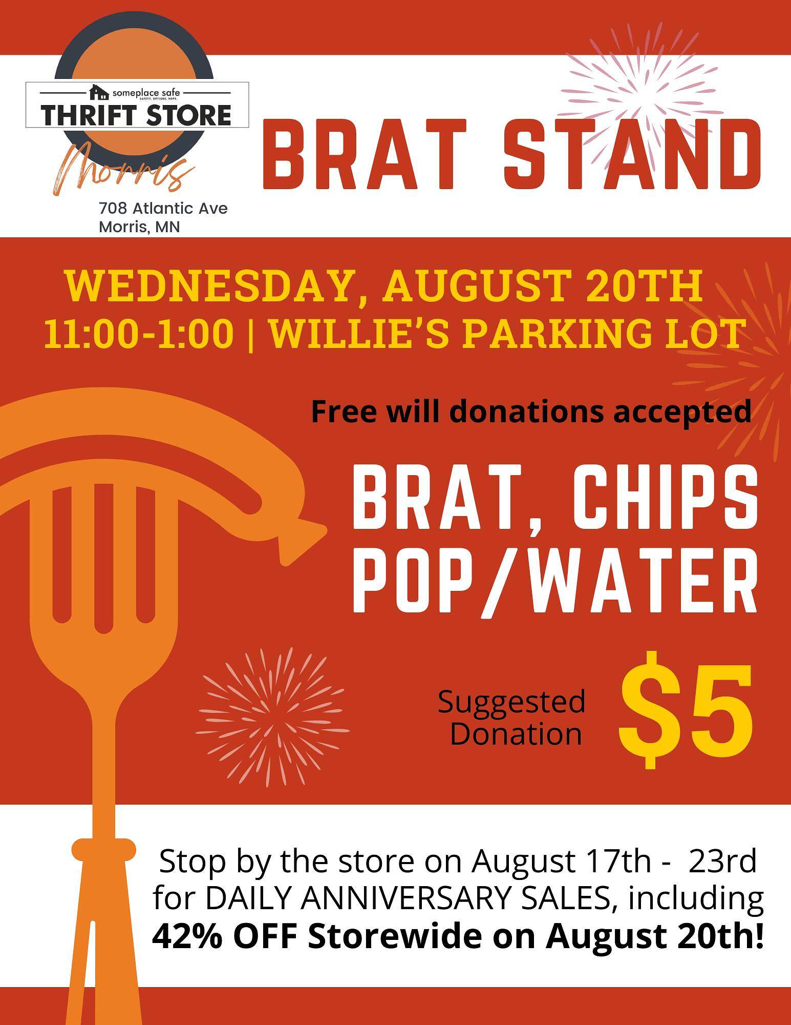 Join the Someplace Safe Morris Thrift Store for lunch next week for our annual BRAT STAND at Willie's Supervalu! Grab a brat, chips and pop/water from 11am to 1pm on Wednesday, August 20th for a suggested donation of $5. *Be sure to also stop by the store that day and shop the 42% OFF Storewide […]