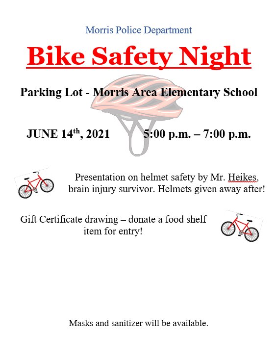 The Morris Police Department is hosting a Bike Safety Night in the Morris Area Elementary School parking lot. Helmets will be given away after a presentation on helmet safety.