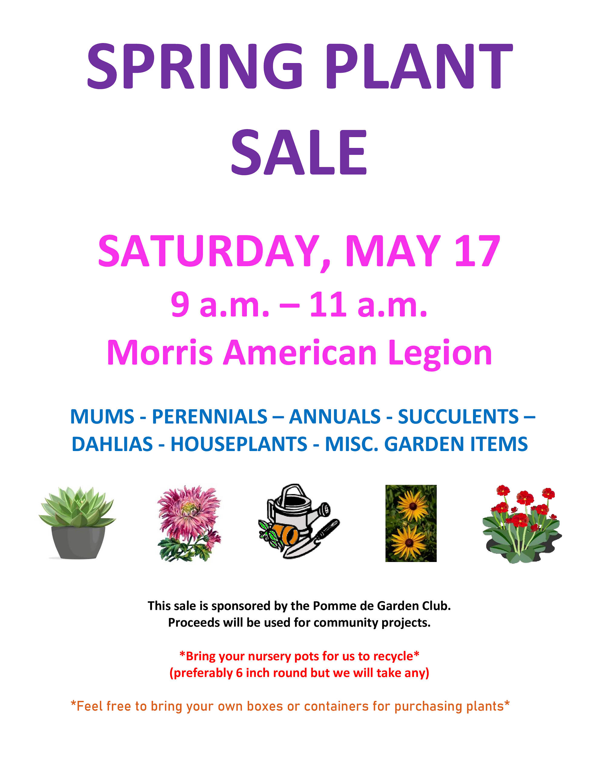 The annual Spring Plant Sale will be held Saturday, May 17, 9 am to 11 am at the Morris American Legion. There will be Mums, Perennials, Annuals, Succulents, Dahlias, Houseplants and Miscellaneous Garden items. Sale sponsored by the Pomme de Terre Garden Club. Proceeds will be used for community projects.
