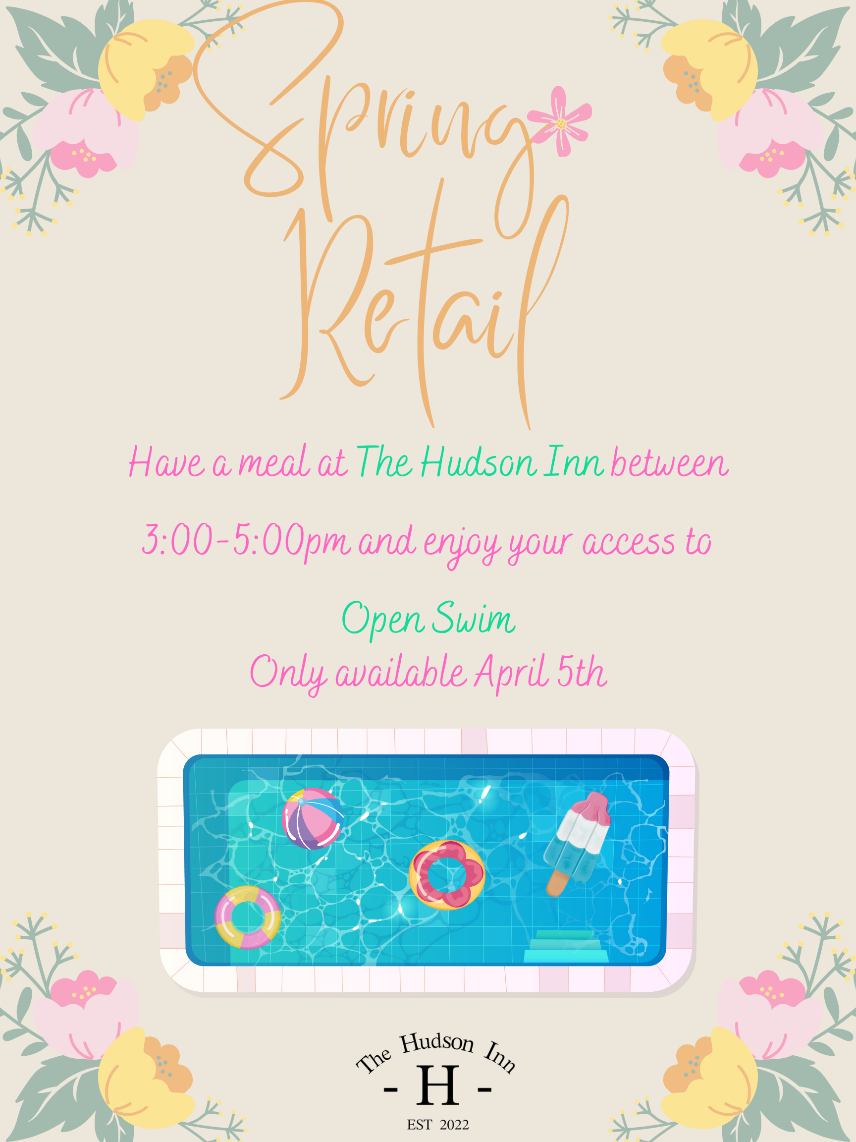 The Hudson Inn 200 HWY 28 East, MorrisHave a meal at The Hudson Inn between 3:00 - 5:00 and enjoy your access to open swim. Only on April 5th